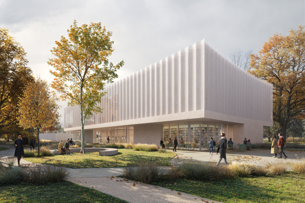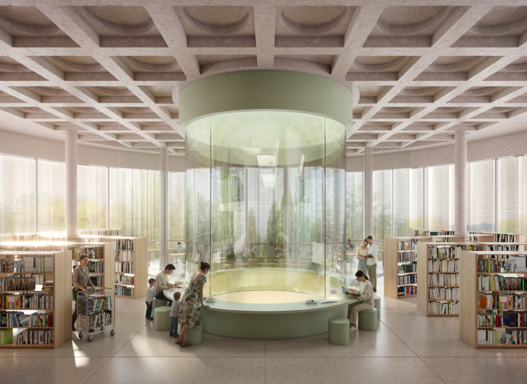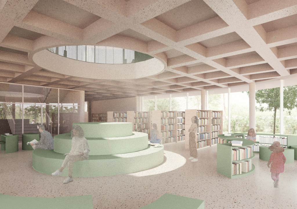 Dwukondygnacyjny budynek biblioteki ma zwartą bryłę i charakterystyczne proporcje kondygnacji parteru w stosunku do masywnego, nadwieszonego piętra. Architektura biblioteki celowo nawiązuje do modernistycznych pawilonów. Podcięty i przeszklony parter sprawia, że budynek staje się bardziej przystępny, “wciągając” użytkowników do środka. Otwarty parter został zaprojektowany jako dostępna i zapraszająca przestrzeń publiczna.  Ma pełnić nie tylko funkcjęmiejskiej biblioteki, lecz również lokalnego centrum kultury, które będzie ożywiać życie społeczne