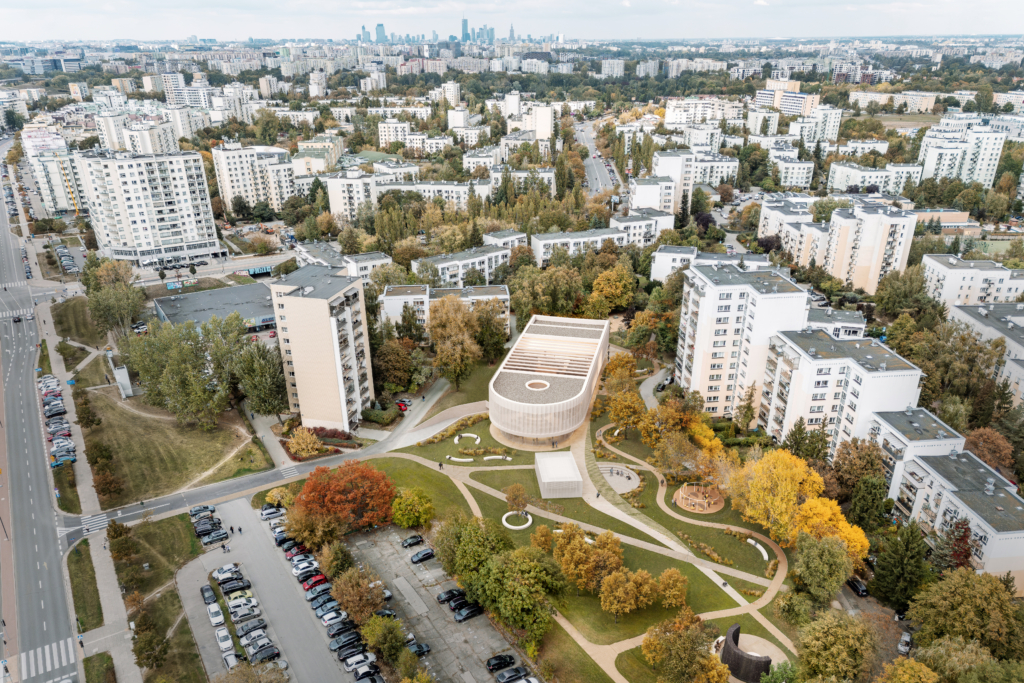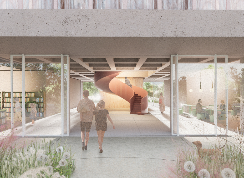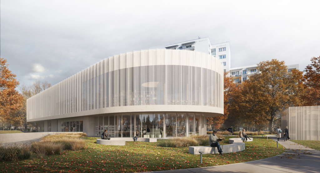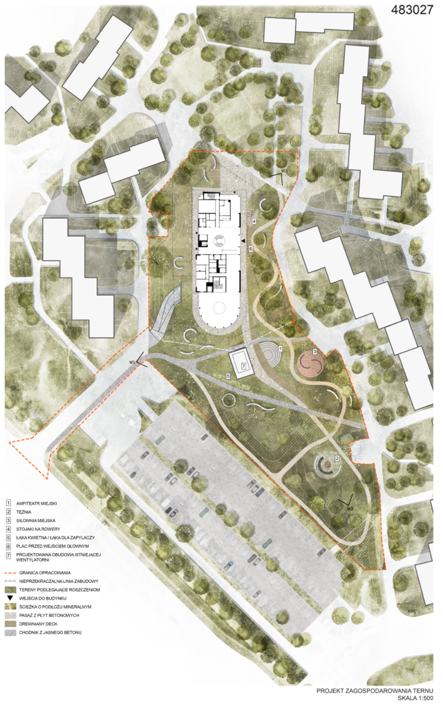 Projektowany budynek jest silnie powiązany z parkiem poprzez wspólne wnętrza urbanistyczne, piesze alejki oraz przestrzenie sąsiedzkiej integracji. Forma budynku wynika z charakteru otaczającego go kontekstu. Od strony północnej budynek wpisuje się w tkankę zabudowy poprzez swoją geometryczną formę, natomiast od strony południowej, dzięki zaokrągleniu miękko wtapia się w zieleń. Dzięki takiemu zabiegowi budynek otwiera się na park. W tej części celowo umieszczono funkcję biblioteki, aby powiązać ją widokowo z zielonym otoczeniem zewnętrznym.
