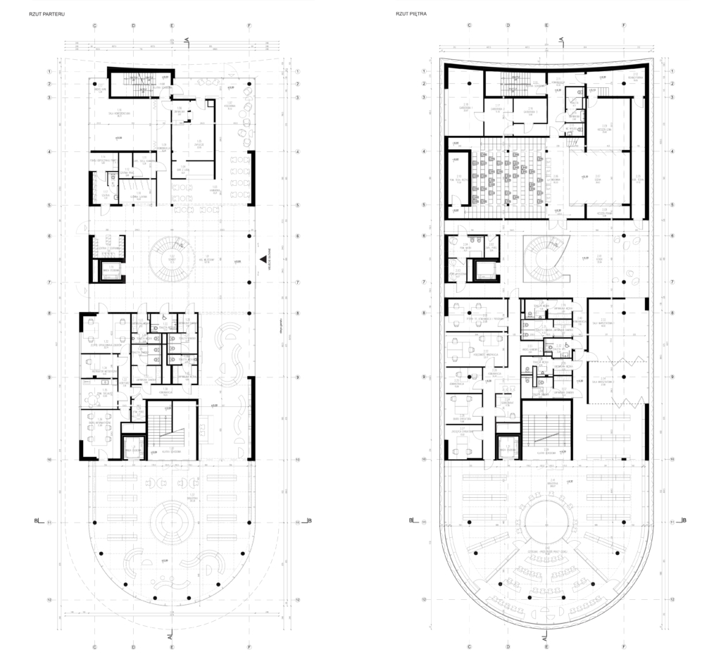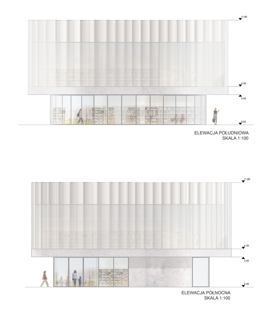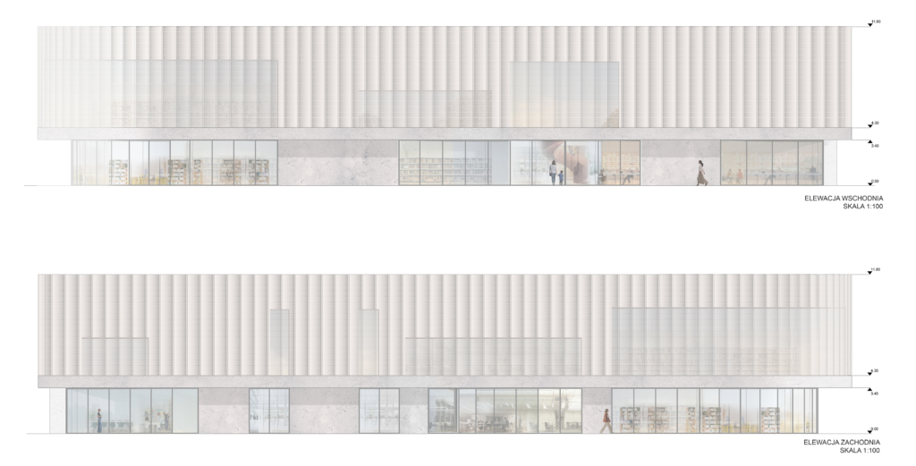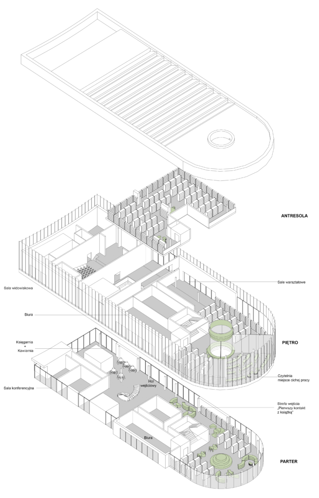 Obydwie części zostały połączone przez dwukondygnacyjną strefę holu wejściowego z foyer. Taki podział, z oddzielną komunikacją pionową dla każdej ze stref, umożliwi sprawne funkcjonowanie obiektu i odpowiada na wytyczne konkursowe. Kawiarnię połączoną z księgarnią celowo umieszczono na parterze budynku od strony głównego ciągu komunikacyjnego prowadzącego od stacji metra Stokłosy. Z tej strony znajduje się dodatkowe wejście do budynku. Od tej strony również znajduje się sala warsztatowa, która