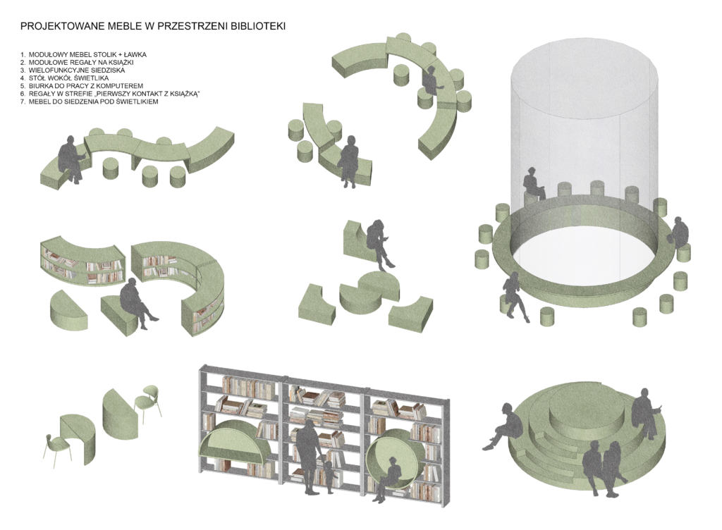kondygnacje umieszczono stół z siedziskami. Dodatkowo między regałami zaprojektowano