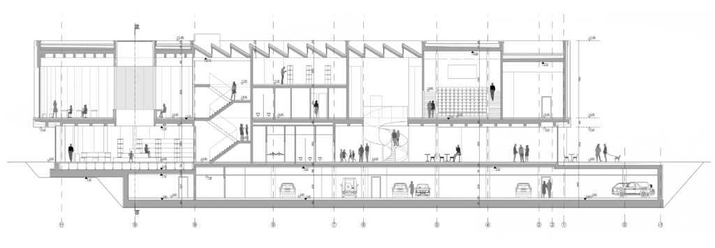 przestrzeń na zbiory biblioteki. Została ona doświetlona za pomocą szedowego dachu.