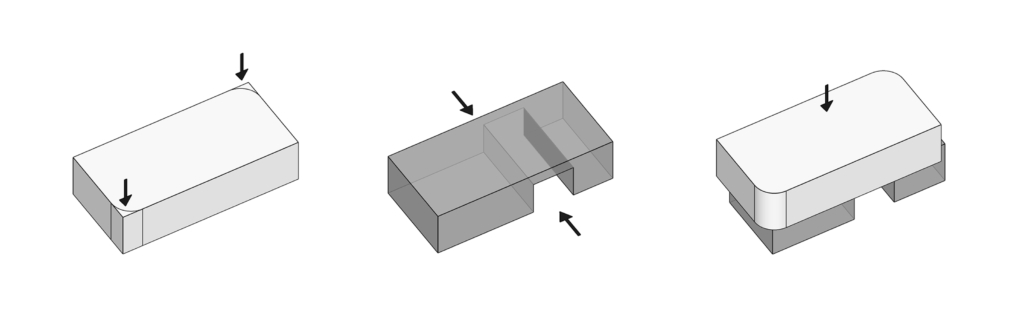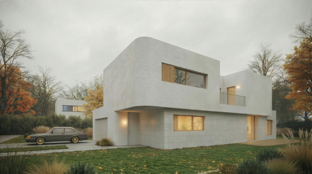 Projekt domu to ukłon w stronę architektonicznej klasyki XX wieku – płynne linie i charakterystyczne, zaokrąglone narożniki, nawiązują do stylu modernistycznych willi podmiejskich. Fasada frontowa, od strony ulicy, jest ślepa, co podkreśla minimalistyczną geometrię bryły. Od strony południowej parter jest podcięty i wykończony kontrastującym materiałem, co nadaje lekkości i dynamiki całości. Górna kondygnacja cofnięta od strony wschodniej ma ma celu optyczne zmniejszenie skali budynku. Charakterystyczne dla modernizmu horyzontalne okna podkreślają rozciągnięcie bryły w poziomie. W kondygnacji parteru pojawia się przeszklenie „na wylot” tworzące wrażenie dziury w masie bryły.