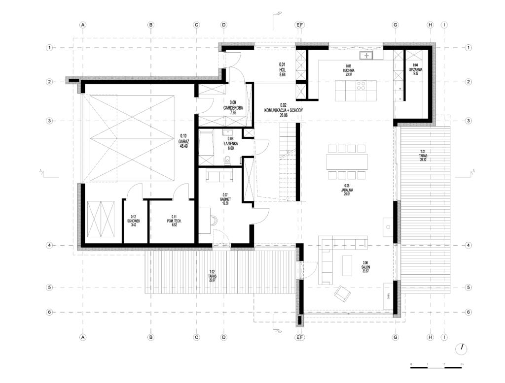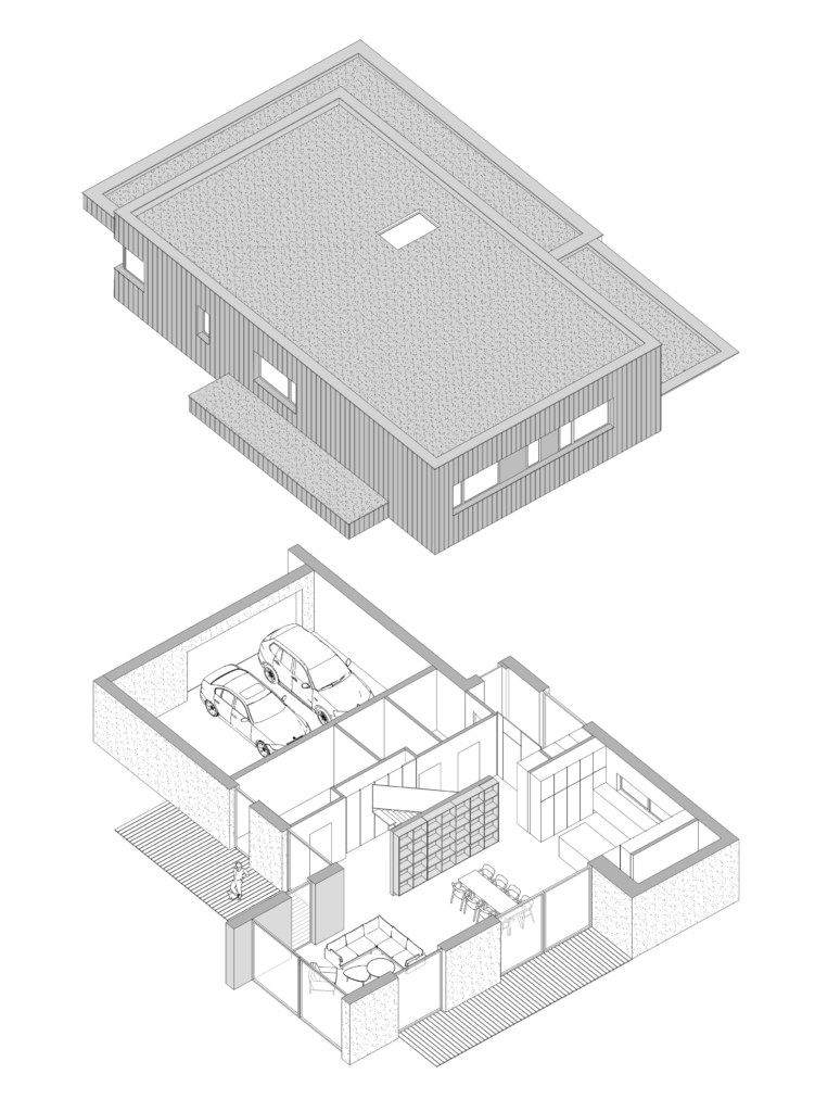 Strefa dzienna: kuchni, jadalni i salonu posiada otwarcia widokowe na różne strony świata co zapewnia dostęp do naturalnego światła przez cały dzień. Ciemna elewacja piętra, wykonana z opalanego drewna, góruje nad lekkim parterem dodając bryle ciężaru i wrażenia osadzenia w przestrzeni.
