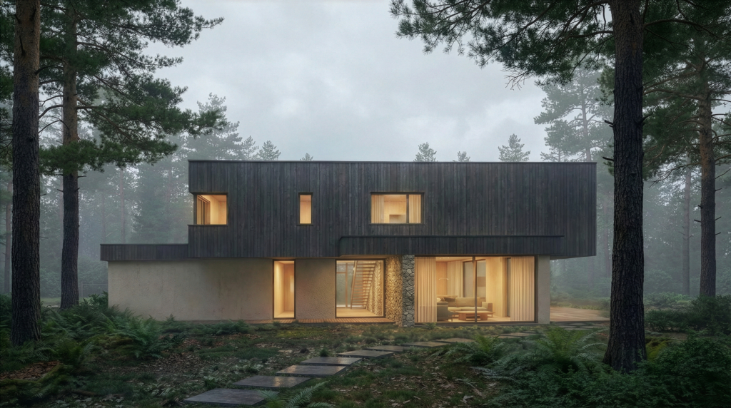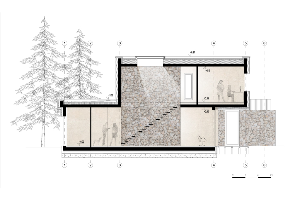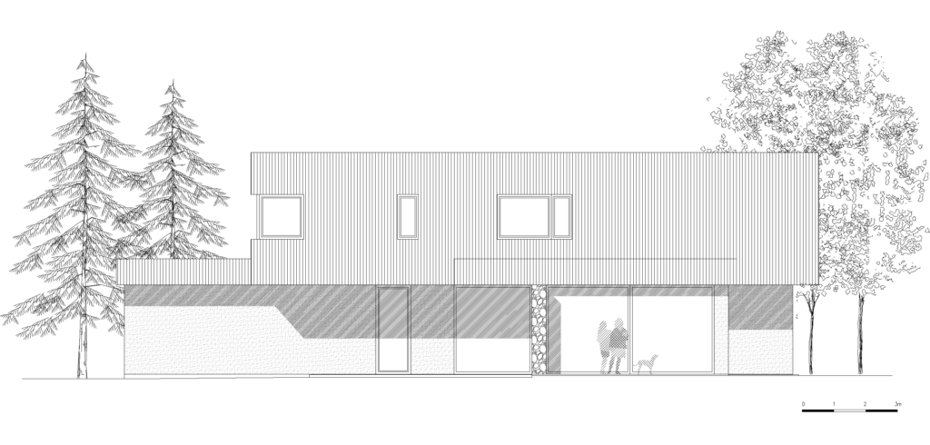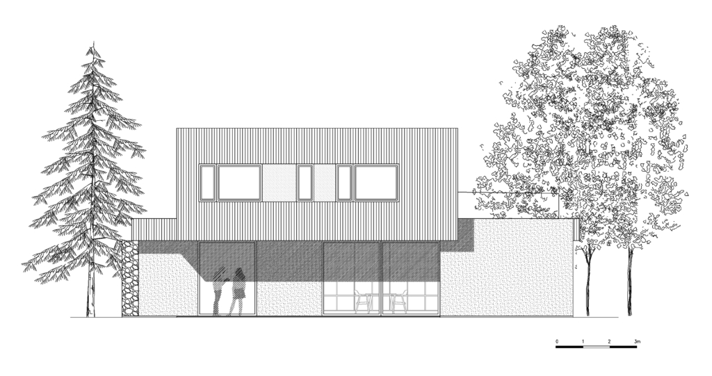 Budynek powstał w oparciu o koncepcję rozczłonkowanej formy, która harmonijnie wpisuje się w zalesiony charakter działki. Miejsce połączenia kilku brył tworzy centralny punkt domu, gdzie znajduje się jadalnia – miejsce, wokół którego koncentruje się życie mieszkańców. Poszczególne strefy domu zostały podkreślone przez horyzontalne ściany, które przenikają z zewnętrza do wnętrza, zacierając granicę między domem a ogrodem. Zaakcentowane są charakterystycznym wykończeniem z kamienia naturalnego układanego na dziko.